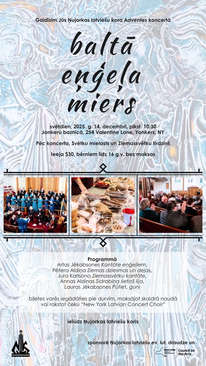 2026 Jan 03❄️❄️❄️Tuvojas Ņujorkas latviešu kora 14. decembra koncerts "Baltā eņģeļa miers", plkst. 10.30 Jonkeru baznīcā, Ņujorkā! Ieeja $30, bērniem līdz 16.g.v. bez maksas. Programmā - Annas Aldiņas, Artas Jēkabsones, Lauras Jēkabsones, Pētera Aldiņa un Jura Karlsona skaņdarbi. Pēc koncerta: Svētku mielasts un Ziemassvētku tirdziņš