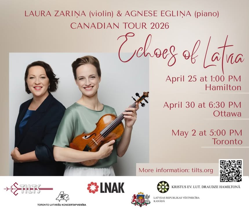 🇨🇦 TILTS is delighted to announce the "ECHOES OF LATVIA" Concert Tour in Canada with violinist Laura Zarina and pianist Agnese Egliņa from April 25 to May 2, 2026 organized in coordination with the Latvian National Federation in Canada/Latviešu Nacionālā Apvienība Kanadā, Christ Latvian Evangelical Lutheran church in Hamilton, the Toronto Latvian Concert Association and Embassy of Latvia in Canada / Latvijas vēstniecība Kanādā Further information: via the QR code or at www.tilts.org (Events section).